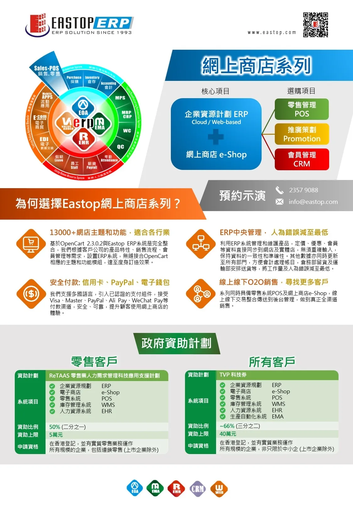 疫情嚴峻,各行各業現時面臨各種挑戰,包括: (1)實體店人流減少,急切尋找新客源。 (2)若員工受感染,店鋪隨時需要停業,進行消毒。 東昇企業資源計劃系統 (Eastop ERP) 及網上商店 (e-Shop) ,或成為您的另一出路!相關系統詳情,請參閱下圖。 如有任何查詢,歡迎與我們聯絡! 電話: (852) 2357 9088 電郵:info@eastop.com #Cloud ERP System #Mobile ERP System #Web ERP System #e-Shop #Omini-Channel #B2B #O2O #WMS #ERP系統 #進銷存系統 #POS #零售系統