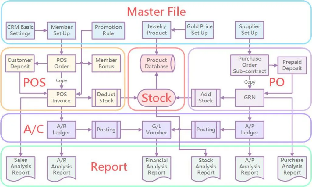 1.Product Management: Generate unique product code to record all particulars of each jewelry, including detail specification, cost, price, base price, certificate, purchase, sales and inventory;