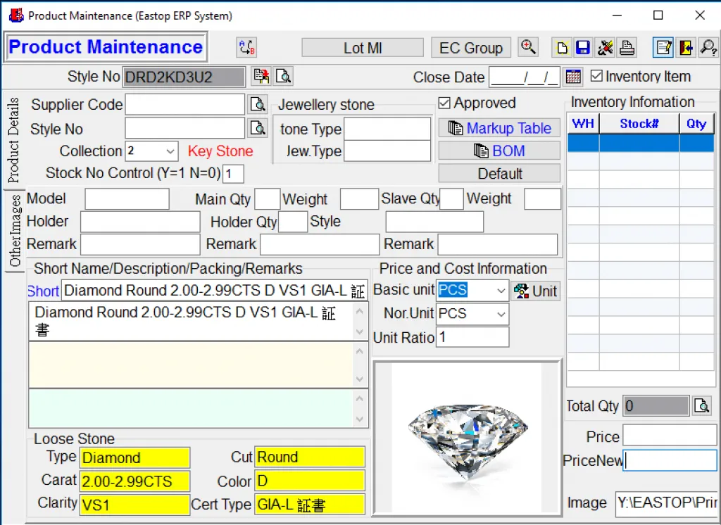 Key Stone: Basic Unit is PC, record CTS, size, color and certificate, auto generate lot no. for each pieces of stone for inventory enquiry;