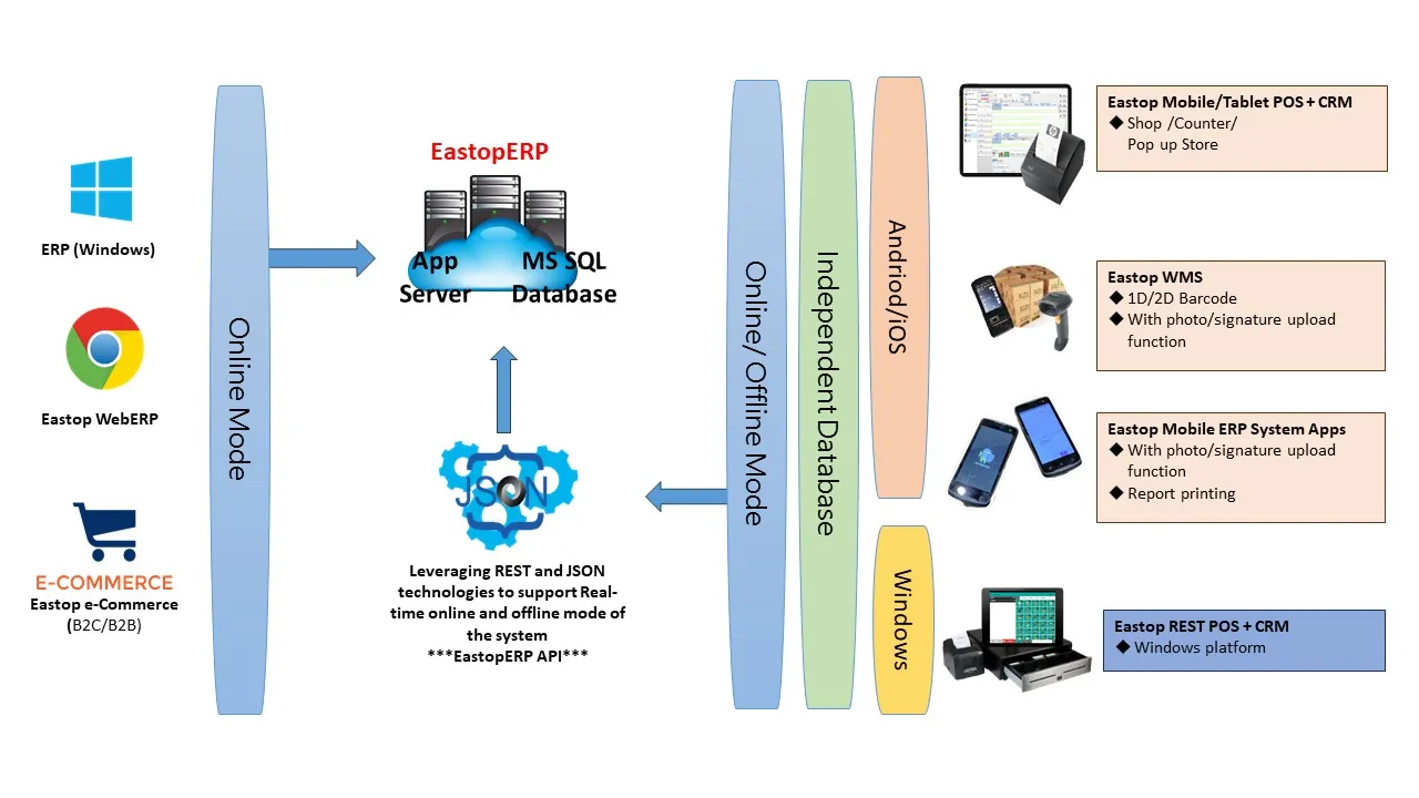 To cater to the mobile ERP trend and market demands, our Eastop ERP company began a series of research initiatives in 2012, ultimately leading to the successful development of a mobile ERP APP solution for our clients. This mobile ERP system also leverages RESTful technology and JSON to deliver a truly modern Mobile ERP system.
