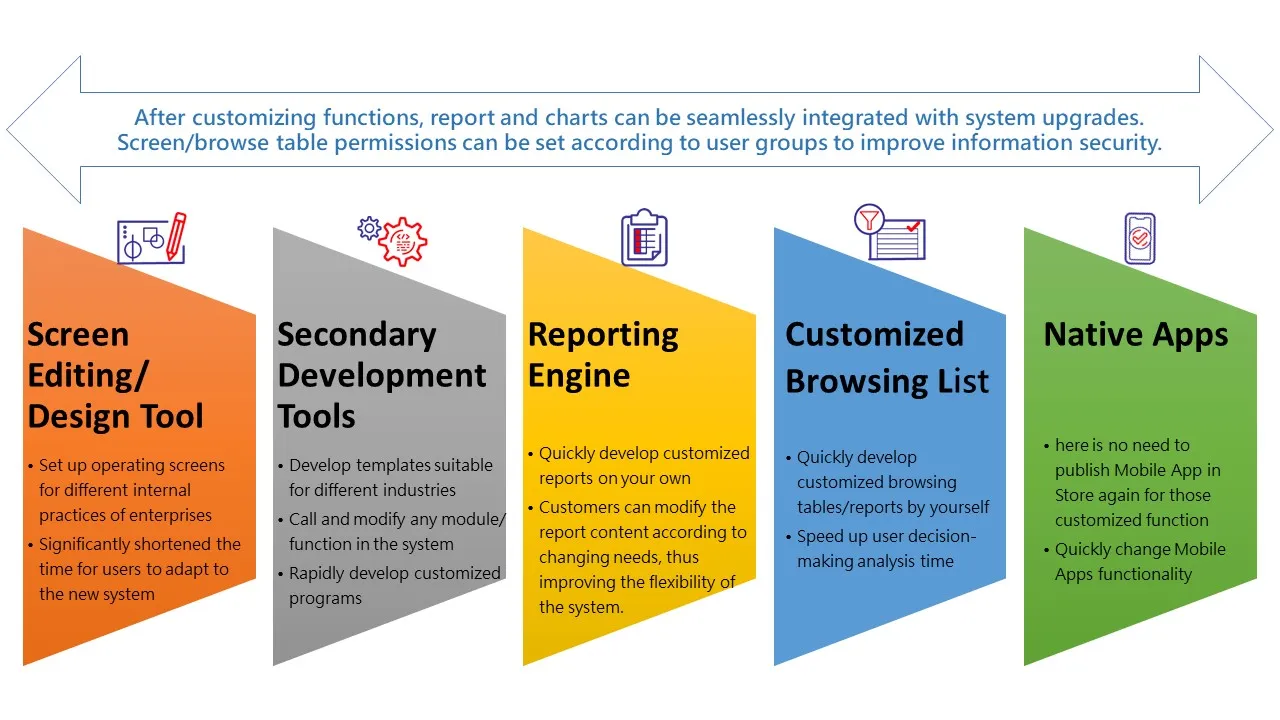 In this era of rapid digital development, businesses must rely on advanced technological solutions to enhance efficiency and strengthen competitiveness. Each industry and company has its unique history and specific needs. In order to help clients achieve customized effects while maintaining continuous system upgrades and enhancements, Eastop has developed numerous tools in the ERP domain and offers skills transfer, enabling clients to independently develop reports, modify interfaces, and even add modules.