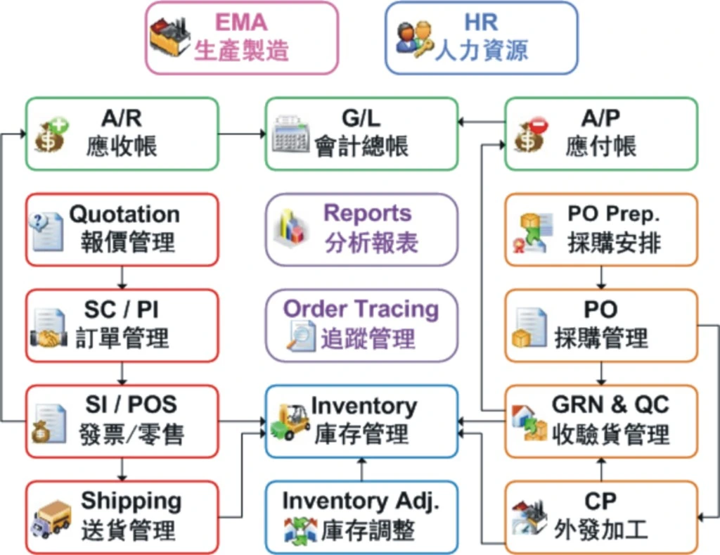此模組涵蓋了企業資源計劃的採購流程操作。 採購管理系統包括產品採購安排、草擬採購單、採購單管理、外發加工管理(Commission Process)、還有收貨單之管理,以及採購發票等等。採購數據能夠立即從合同/發票/產品資料/庫存數據自動產生,這亦配合到全面的分析銷售和庫存報表,助大家可以及時做最佳的採購商決定。此外,採購資料也可以即時自動展示到庫存及會計應付帳單,是香港企業對進銷存系統推薦之必然選擇。