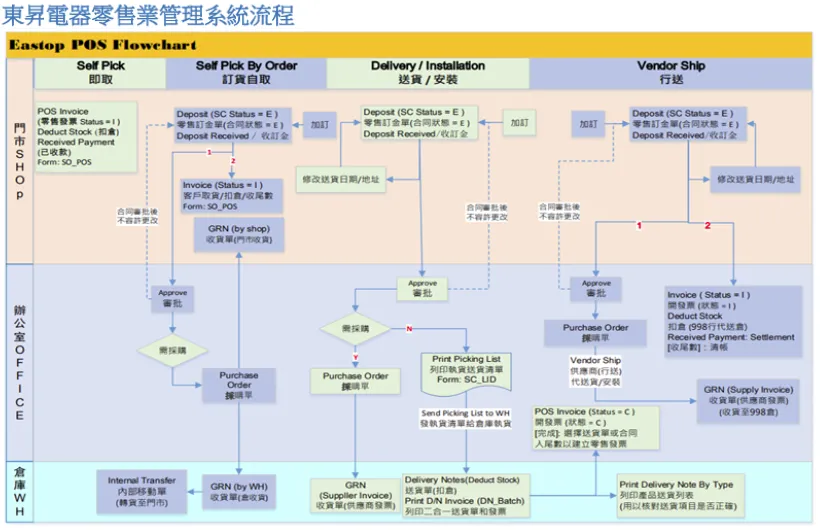 | 4. | 整合流程管理: 4.1 POS零售画面中增加「采购单」按键,让后勤员工在批单时如发现库存不足时可立即在零售画面中进行采购电器的动作,及时补货,增加采购效率; 4.2 POS行送货行收款 (供应商直接送货及收款) 的功能,调至行送模式时,系统会自动把出货的仓转为行送仓 (供应商货仓),而东升在POS零售画面中增加的「采购单」按键,可以在下行送单时,即时按采购键做采购,同时也能把客户的送货地址带落采购单和发送给供应商,做到自动化生产。 |
